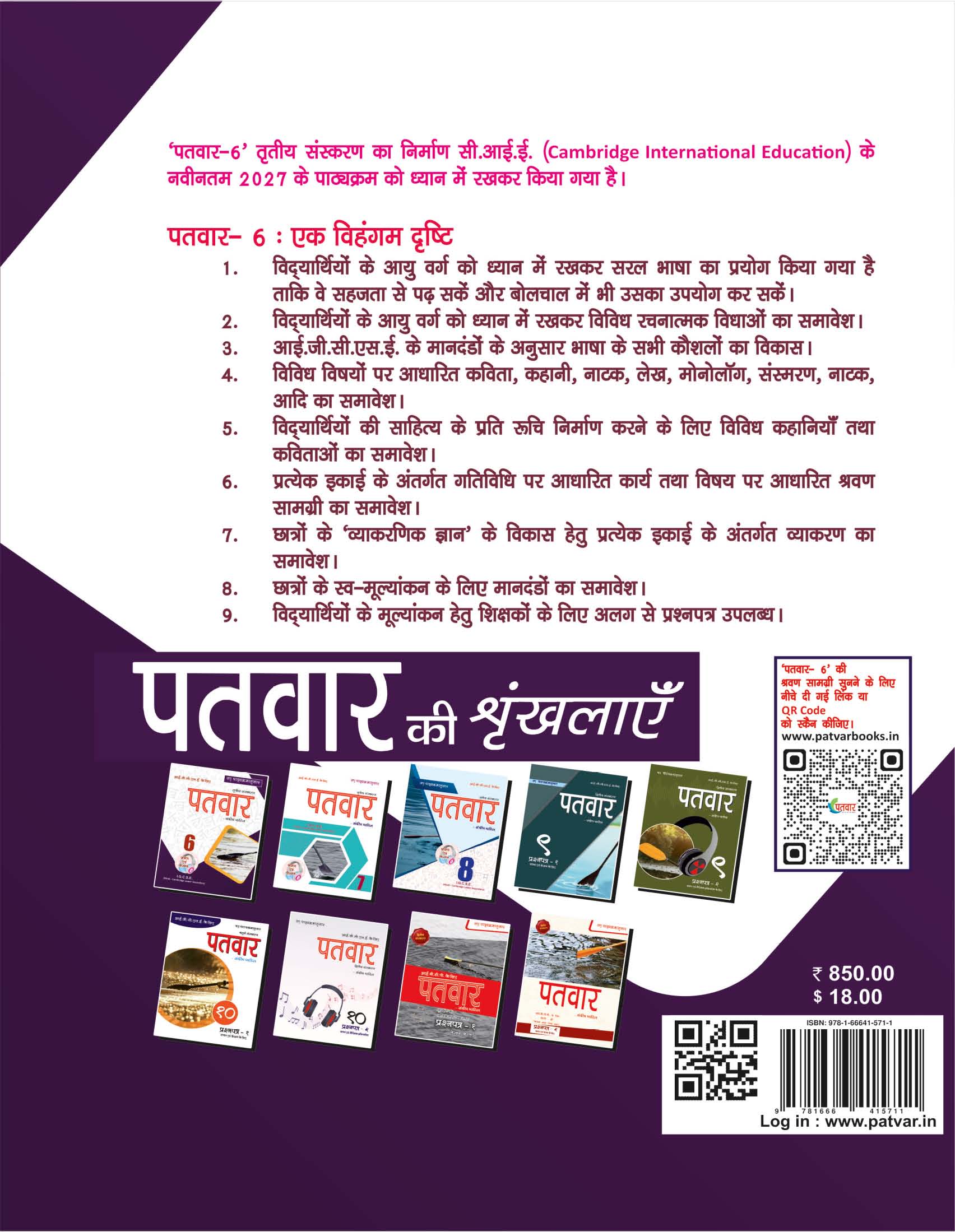Patvar IB- M.Y.P. & IGCSE Hindi Text Book & Listening - Grade 6 2026 edition